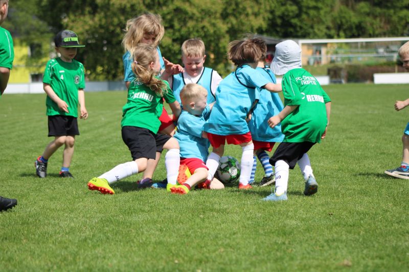 Zum jährlich stattfindenden Traditionsturnier des FC Chemie Triptis am 01.05., durften auch unsere jüngsten Nachwuchskickerinnen und Nachwuchskicker ihre schon vorhandenen und angelernten Fähigkeiten unter Beweis stellen. Zunächst stand ein Spiel der Kindergärten auf dem Plan. Die Jungs und Mädels aus beiden Triptiser Kitas sowie aus Mittel- und Oberpöllnitz wurden zu zwei bunt gemischten Mannschaften zusammengewürfelt und konnten sich so in einem Schlagabtausch über 2x10 Minuten messen. Das finale Endergebnis war hierbei aber allen völlig egal, denn der Spaß für die Kids stand bei dieser Aktion im Mittelpunkt.